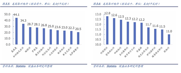 電價:美國是全球電價最低的國家之一,且個別州因為能源優(yōu)勢有更低的電價水平。美國電力消費結構主要劃分為4個領域:居民、商業(yè)、工業(yè)和運輸。2024年9月居民用戶電價為0.17美元/千瓦時(約折1.24元/千瓦時,匯率截至12月13日),商業(yè)用戶電價為0.135美元/千瓦時(約折0.98元/千瓦時);工業(yè)用電價為0.09美元/千瓦時,運輸用電價為0.13美元/千瓦時,2023年批發(fā)電價為0.036美元/千瓦時。而一些州因為其能源優(yōu)勢電價水平較低,截至2024年4月,德克薩斯州(天然氣和可再生能源豐富)的電價約為0.147美元/千瓦時、路易斯安那州(能源資源豐富)約為0.115美元/千萬時、田納西州(水電資源豐富)約為0.125美元/千瓦時。一些較為耗電的大型基建比如數據中心等,往往在低電價省份建設,上述州府也成為當今算力產業(yè)集中地。