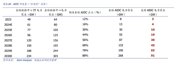研究公司SemiAnalysis利用了5000多個數據中心的分析和建設預測,并將這些數據與全球數據以及衛(wèi)星圖像分析相結合,預計未來幾年數據中心電力容量增長將加速至25%的復合年增長率,同時AIDC占比將進一步提升,數據中心方面,根據預測數據,全球數據中心關鍵IT電力需求將從23年的49GW激增到26年的96GW,我們假設27-30年繼續(xù)保持數據中心25%的復合增速(參考2023到2026年增速,為25%),那么到29、30年全球數據中心關鍵IT電力需求分別增長至188、234GW;參考SemiAnalysis數據,結合AI算力蓬勃發(fā)展、下游應用陸續(xù)爆發(fā)大背景,我們認為未來AI在數據中心中占比有望持續(xù)加速提升,因此我們假設23-30年全球AIDC占比分別達到12%/16%/30%/44%/56%/68%/78%/88%,從而計算出29、30年全球的AIDCIT設備電力需求分別為65GW、91GW。