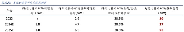 在我們2024年8月6日發(fā)布的報告《AI東風已至,Bitcoin礦場開啟第二增長曲線》中,對Bitcoin礦場用電量進行過假設和預測,在該報告中,據我們預測2024/2025/2026/2027/2028年得州Bitcoin礦場負荷分別為4.7/6.5/8.3/10.1/11.9GW(假設得州Bitcoin礦場年新增負荷為1.8GW),關于得州Bitcoin礦場負荷在美國的份額,我們假設保持28.5%不變,因此據我們預測美國Bitcoin礦場年負荷分別為17/23/29/36/42GW。