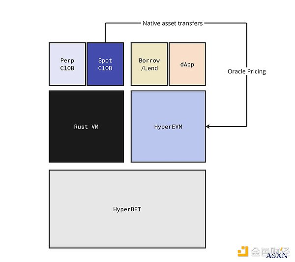 HyperEVM與Hyperliquid的L1具有互操作性,如L1的預(yù)言機(jī)就可以供HyperEVM使用,同時(shí)部分幣種的轉(zhuǎn)賬也可以在兩個(gè)VM之間互通。(無法全部互通,因?yàn)長(zhǎng)1上的資產(chǎn)是「許可」的,只包含USDC和通過HIP-1生成的資產(chǎn),而HyperEVM的資產(chǎn)要多的多)