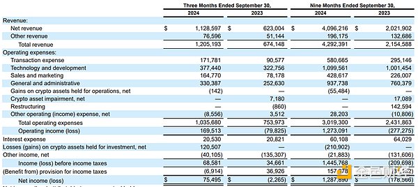 可以看到,2023年Coinbase的運(yùn)營(yíng)費(fèi)用(研發(fā)、管理、銷售費(fèi)用以及轉(zhuǎn)賬費(fèi)用)平均每季度在6億美金以上,這基本相當(dāng)于全部的營(yíng)收,凈利率接近0;在2024年隨著行情爆發(fā),其凈利率有了不少的好轉(zhuǎn),但凈利率仍不足30%。