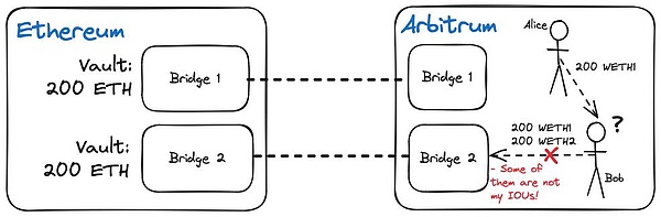 追求效率的Rollup用戶必須使用其他跨鏈橋提供商,這些提供商可以承擔(dān)待處理的Rollup退出的所有權(quán),并在用戶期望的目標(biāo)鏈上提供即時流動性。當(dāng)此類橋使用傳統(tǒng)的鎖定與鑄幣模型時,我們最終會得到由不同協(xié)議發(fā)行的Tokens的多個包裝Tokens,并面臨前文描述過的相同問題。
