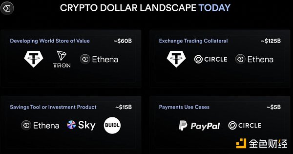 儲蓄工具或投資產(chǎn)品:目前由Ethena和Sky主導(dǎo),幾乎沒有傳統(tǒng)金融體系對鏈上產(chǎn)品的參與,市場規(guī)模約為150億美元。