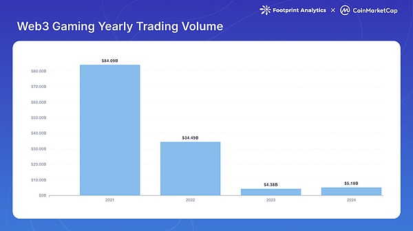 Web3游戲板塊在2024年實現(xiàn)強(qiáng)勁增長,但相較其他加密板塊表現(xiàn)遜色。根據(jù)FootprintAnalytics數(shù)據(jù),游戲Tokens市值年末達(dá)到318億美元,較上年增長60.5%。雖然該板塊在3月創(chuàng)下474億美元的年內(nèi)高點,但仍顯著低于2021年11月創(chuàng)下的1,141億美元歷史高位。