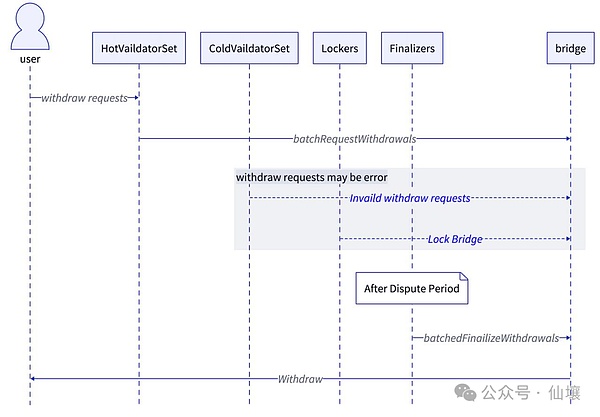 finalizers其實(shí)也是一組特殊的驗(yàn)證者,主要用于確認(rèn)跨鏈橋的狀態(tài)變化,從合約層面來(lái)看主要確認(rèn)的就是用戶存款和提款。Hyperliquid的跨鏈橋使用“提交-確認(rèn)”機(jī)制,比如用戶發(fā)起提款后并不會(huì)被立即執(zhí)行,需要等待一段時(shí)間(這段時(shí)間被稱為爭(zhēng)議期)。等待爭(zhēng)議期結(jié)束后,finalizers內(nèi)的成員執(zhí)行提款交易,提款才可以被正常執(zhí)行。