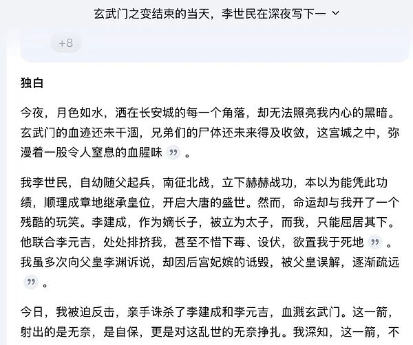 李世民作為千古一君,絕不可能用上面四家輸出結(jié)果那樣傻的語氣說話,而DeepSeek也并沒有用力過猛,用相對古典的文字但并沒有直接用文言文,體貼地兼顧了可讀性。