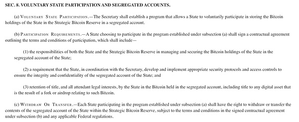 此外,本法案進一步確認并保護個人完全合法地控制Bitcoin和其他數字資產的權利,明確指出維護私人密鑰的能力是金融主權的基本原則,以及在數字時代中對隱私和個人自由的保護。