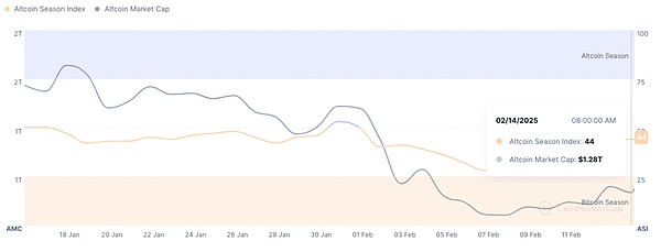 BTC主導(dǎo)指數(shù):截至2月14日,當前BTC主導(dǎo)指數(shù)為59.8%,較1月上半月的55.7%,上漲4.1%。