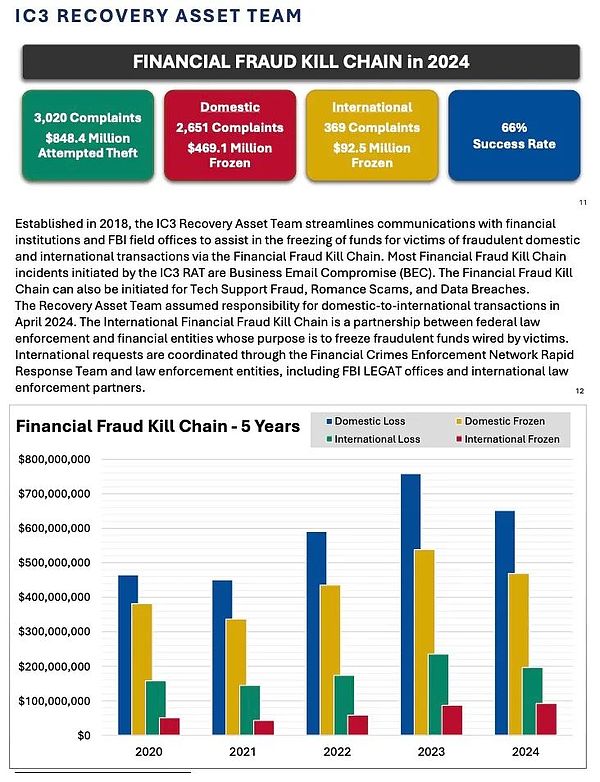 2024年,IC3收到333,981起網(wǎng)絡(luò)詐騙投訴,造成137億美元損失,占全年總損失的83%。主要交易方式包括Crypto、電匯、信用卡支付等。