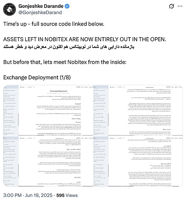 2025年6月18日,鏈上偵探ZachXBT披露,伊朗最大的加密交易平臺Nobitex疑似遭遇黑客攻擊,涉及多條公鏈的大額資產異常轉移。