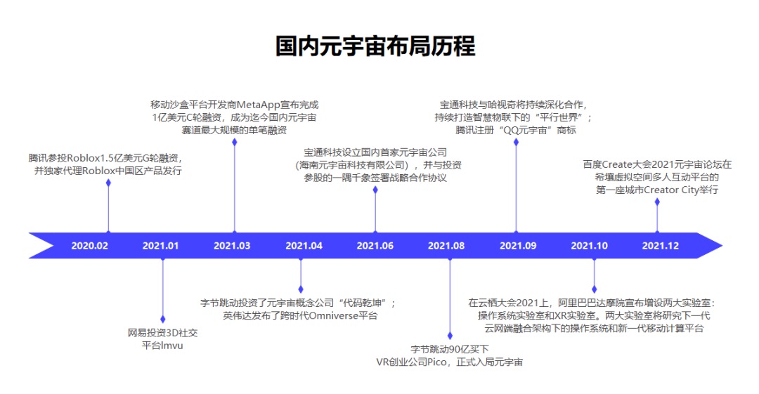 國(guó)內(nèi)企業(yè),主要是互聯(lián)網(wǎng)大廠,2020年就開始爭(zhēng)相布局,比如:騰訊參投Roblox,網(wǎng)易投資Imvu,字節(jié)跳動(dòng)買下Pico,阿里達(dá)摩院增設(shè)操作系統(tǒng)實(shí)驗(yàn)室和XR實(shí)驗(yàn)室,百度甚至直接把Create大會(huì)開在了希壤虛擬空間......