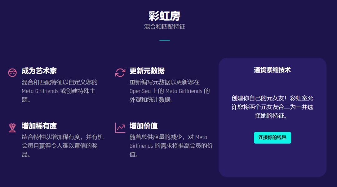 彩虹房,意思就是將2個(gè)元女友放進(jìn)去,最后混合一個(gè)新的出來。按照官網(wǎng)的解釋,這能夠徹底減少元女友的總量,并隨著時(shí)間推移增加總體的價(jià)值。