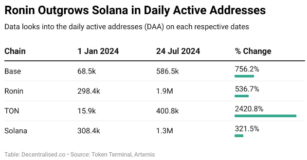 2024年初,Solana在日活躍地址數方面排名第一,但到7月,Ronin以每日多出60萬個活躍地址的優勢超越了Solana。