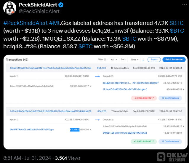 此前上周,Mt. Gox進行了類似的轉移,將28億美元的Bitcoin轉移到新錢包中。Mt. Gox的財產管理員已分發了超過41.5%的Bitcoin,141,686 BTC總量中超過41.5%(即59,000Bitcoin)已被重新分配給債權人。該交易所的主錢包仍擁有82,686 BTC,價值53億美元。