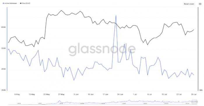 ETH下跌的原因眾多,其中包括2024年美國EthereumETF的資金流出。此外,Ethereum的網(wǎng)絡(luò)活動在過去一個月有所下降。Glassnode的數(shù)據(jù)顯示,Ethereum每日活躍地址(DAA)數(shù)量從6月22日的711,078個地址減少到7月10日的426,472個。
