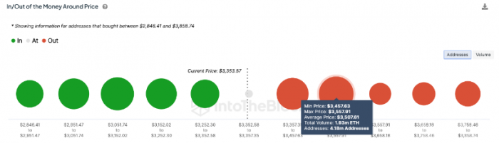 以太基基金的持續(xù)流出反映了負(fù)面的技術(shù)背景。以太幣最近的復(fù)蘇嘗試因3500美元以上的供應(yīng)擁堵而被拒絕,這表明該區(qū)域是ETH復(fù)蘇之路上的重要障礙。IntoTheBlock的數(shù)據(jù)強(qiáng)化了該阻力區(qū)的重要性。其In/Out of the Money around Price (IOMAP)模型顯示,該區(qū)域價格范圍為3457美元至3557美元,其中418萬個地址購買了約193萬個ETH。