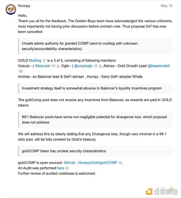 Humpy處理社區(qū)反饋如下:承認(rèn)關(guān)于缺乏事先討論的批評并取消提案247;提供GOLD多重簽名的詳細(xì)信息;創(chuàng)建具有“Trust Setup”(信托設(shè)置)的新提案。
