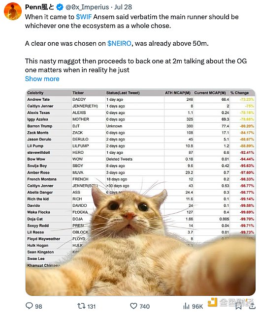 Andrew Tate的 DADDY 是表現最好的名人Tokens,回報率為 -73%。另一端情況也好不到哪里去: